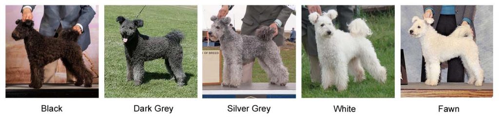 The Pumi comes in many solid colors. They can be any shade of gray, black, white, and fawn. The gray puppies are born black and fade to some shade of gray. In addition, they may have lighter gray shadings on the head and legs. They fawns (the Hungarian term is “fakó”) are usually born dark brown/black and fade to some shade of fawn, even appearing to be a creamy white. The whites are born white and stay that way. Occasionally a black and tan patterned puppy is born (like a black and tan Doberman). This is not an allowed color in the standard.